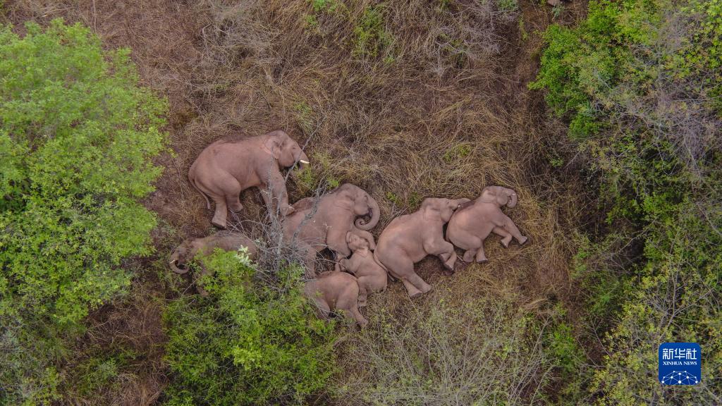 6月7日在云南省昆明市晉寧區(qū)夕陽(yáng)彝族鄉(xiāng)拍攝的野象(無(wú)人機(jī)照片)。新華社發(fā)