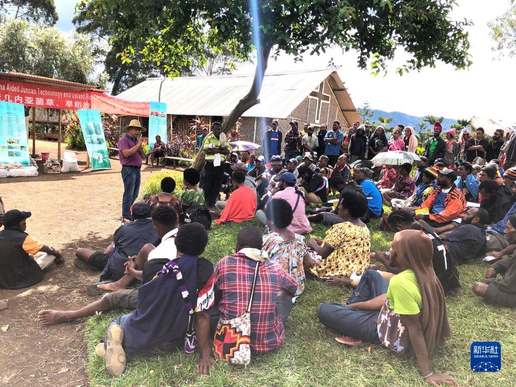 2020年12月15日,中國(guó)援巴布亞新幾內(nèi)亞菌草旱稻項(xiàng)目專家組組長(zhǎng)林應(yīng)興(戴草帽者)在巴布亞新幾內(nèi)亞?wèn)|高地省中國(guó)援助巴新菌草和旱稻技術(shù)項(xiàng)目第9期培訓(xùn)班上授課。新華社發(fā)