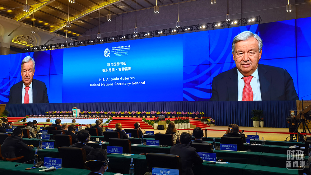 △聯(lián)合國(guó)秘書長(zhǎng)古特雷斯通過(guò)視頻方式致辭。(總臺(tái)央視記者舒貝拍攝)
