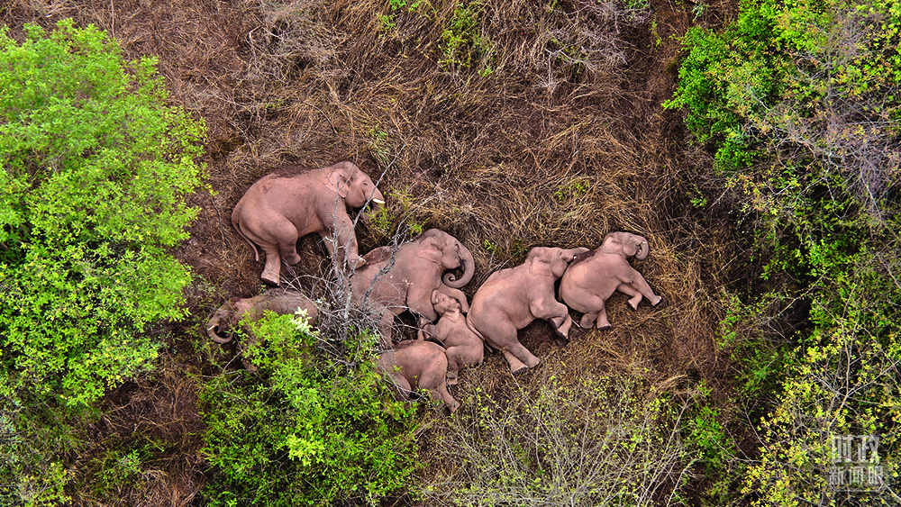 △2021年6月7日,云南省森林消防總隊(duì)的無(wú)人機(jī)監(jiān)測(cè)人員觀測(cè)到野象群暫停遷徙的一幕。這是監(jiān)測(cè)野象12天來(lái),第一次發(fā)現(xiàn)象群集體躺著睡覺。(圖/視覺中國(guó))