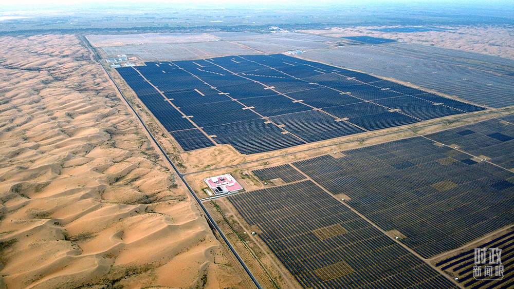 △內(nèi)蒙古鄂爾多斯,達(dá)拉特旗光伏發(fā)電領(lǐng)跑獎(jiǎng)勵(lì)基地,是全球最大的沙漠集中式光伏電站。(圖/視覺中國(guó))