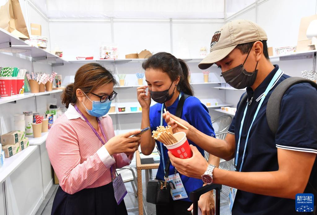 10月15日,在第130屆廣交會上,來自哈薩克斯坦的采購商在和一家環(huán)保餐具參展商(左)洽談。新華社記者 劉大偉 攝