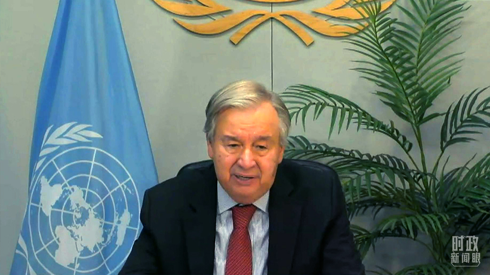 △聯(lián)合國秘書長古特雷斯通過視頻方式發(fā)表致辭。