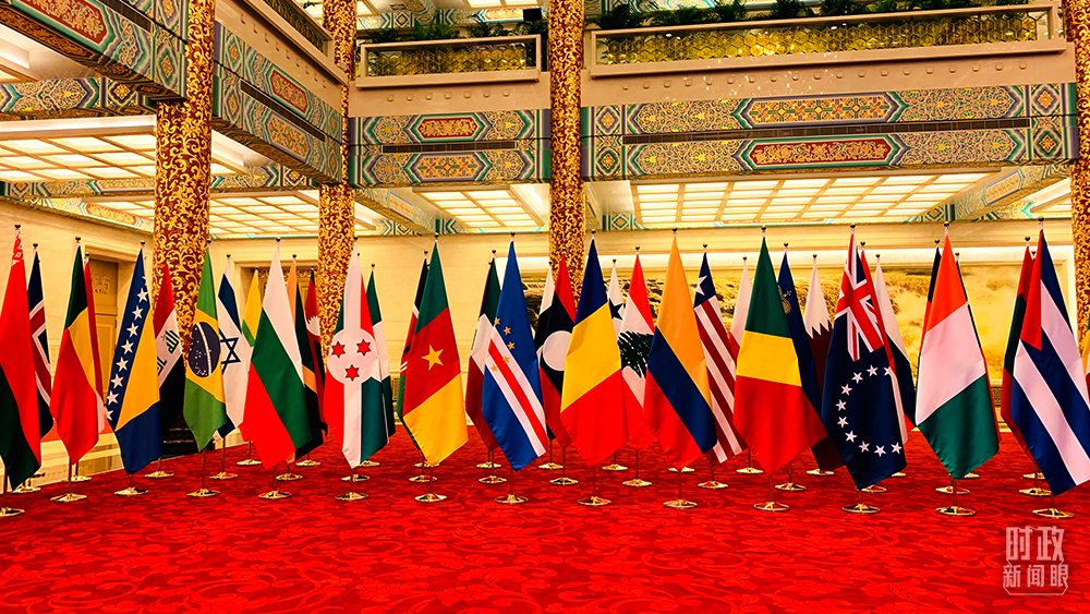 △紀念會議現(xiàn)場,聯(lián)合國各會員國國旗組成的旗陣。(總臺央視記者范一鳴拍攝)