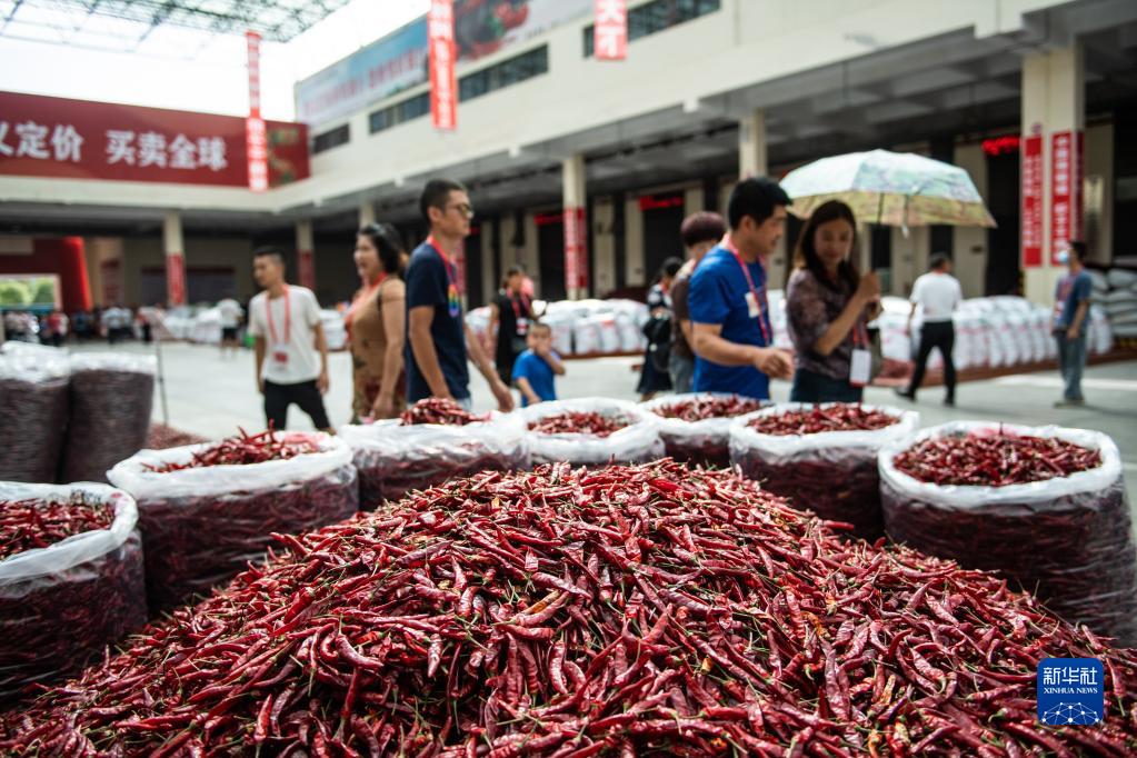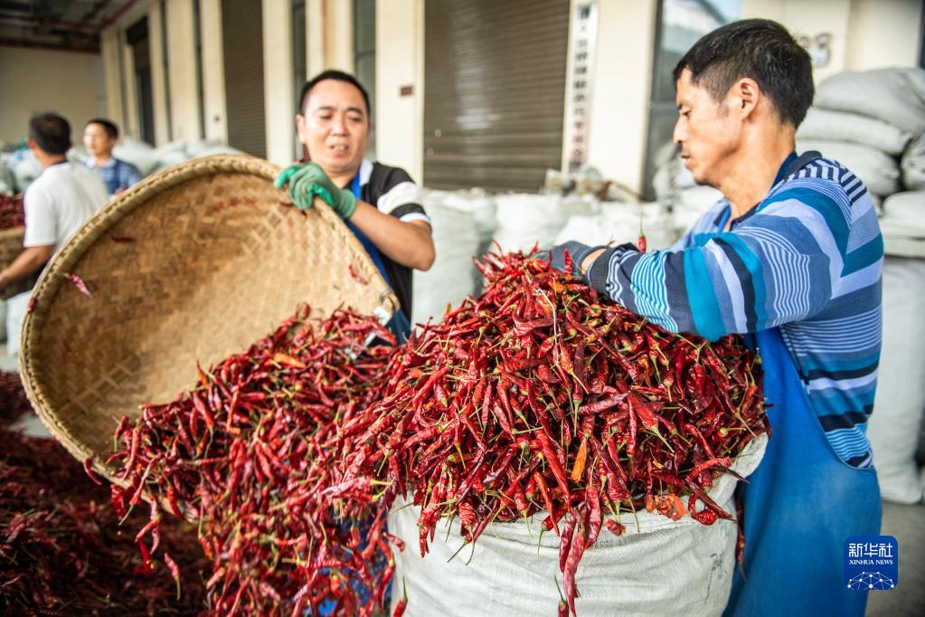 經(jīng)銷(xiāo)商在遵義市新蒲新區(qū)中國(guó)辣椒城挑選辣椒(2020年8月18日攝)。新華社記者 陶亮 攝