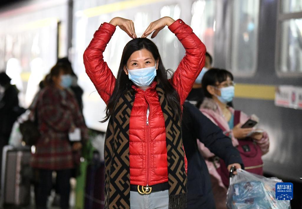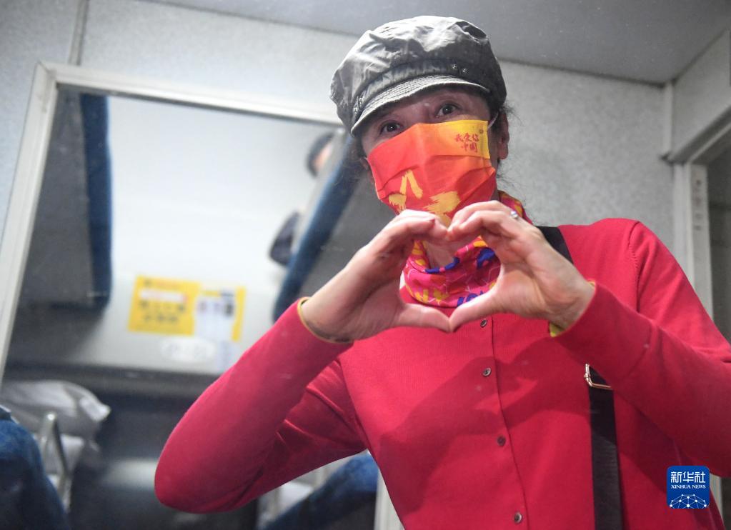 10月29日,一名滯留游客離開額濟納旗時,在列車車廂里用雙手比劃出“愛心”。新華社發(fā)(王磊 攝)