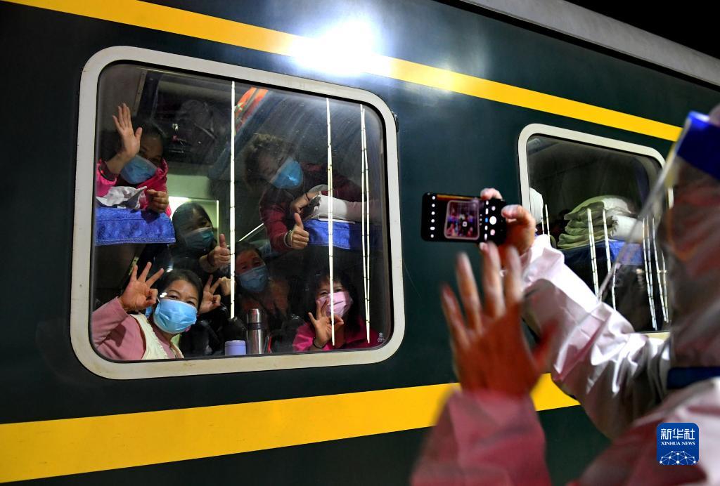 10月29日,滯留游客離開額濟納旗時,在列車車廂里與地面人員告別。新華社發(fā)(王磊 攝)