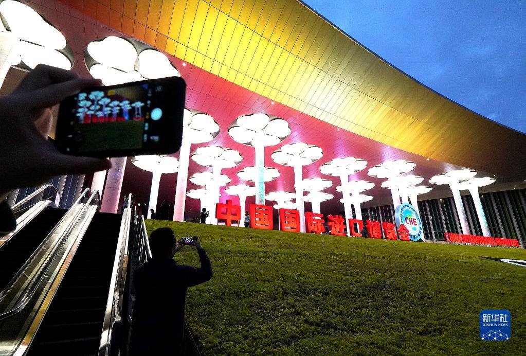 2018年11月4日,人們?cè)谂臄z國家會(huì)展中心(上海)場館夜景。2018年11月5日,首屆中國國際進(jìn)口博覽會(huì)在上海開幕。新華社記者 陳飛 攝