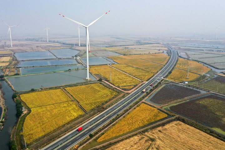 圖為11月3日拍攝的江蘇省揚(yáng)州市寶應(yīng)縣魯垛鎮(zhèn)5.28萬千伏安風(fēng)力發(fā)電項(xiàng)目(無人機(jī)照片)。新華社記者 李博 攝