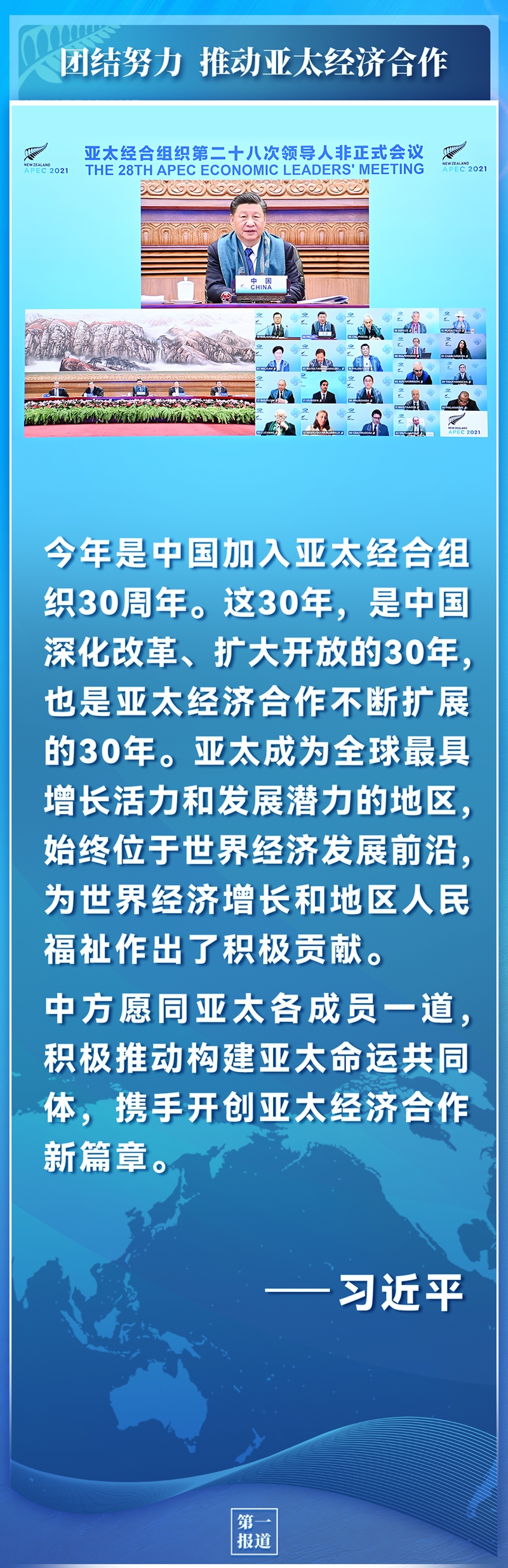 很高興同大家見面。首先,我感謝阿德恩總理和新西蘭政府為本次會議作出的努力。本次會議以“推動疫后經(jīng)濟復(fù)蘇,實現(xiàn)亞太人民和子孫后代的共同繁榮”為主題,具有十分重要的意義。