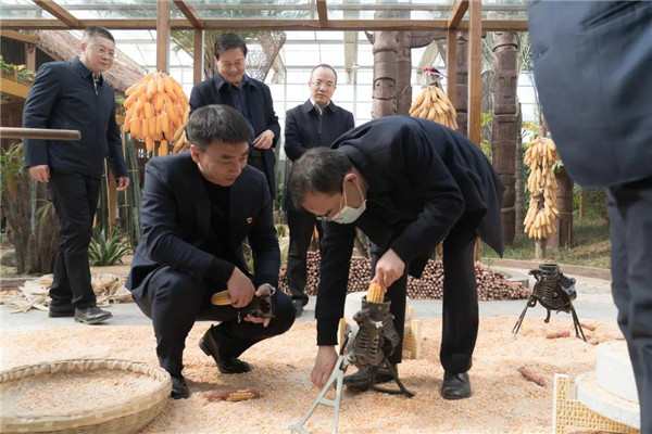 在上古農(nóng)耕文化、現(xiàn)代農(nóng)業(yè)科技與地方特色農(nóng)業(yè)相結(jié)合的神農(nóng)百草園里,高廳長饒有興趣的親自體驗(yàn)農(nóng)事活動(dòng)的玉米脫粒。調(diào)研組一行還參觀了各項(xiàng)高科技栽培種植及研學(xué)課堂區(qū)域。