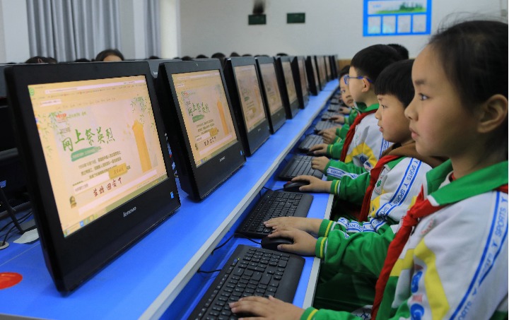 2019年4月3日,湖南吉首大學(xué)師范學(xué)院附屬小學(xué)的學(xué)生們參加網(wǎng)上祭英烈活動(dòng)。新華社發(fā)(彭彪 攝)