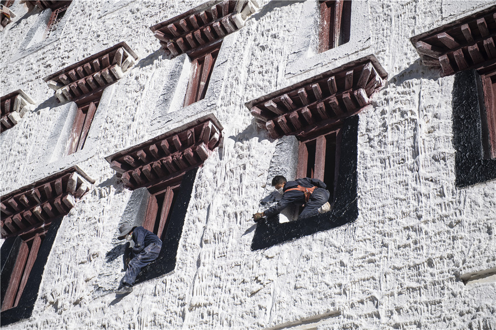 2021年10月21日,工作人員在西藏布達(dá)拉宮進(jìn)行年度粉刷工作。新華社記者 孫瑞博 攝