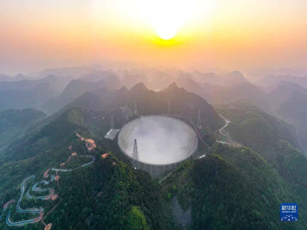 3月31日清晨拍攝的“中國(guó)天眼”全景(維護(hù)保養(yǎng)期間拍攝,無人機(jī)照片)。新華社記者 歐東衢 攝