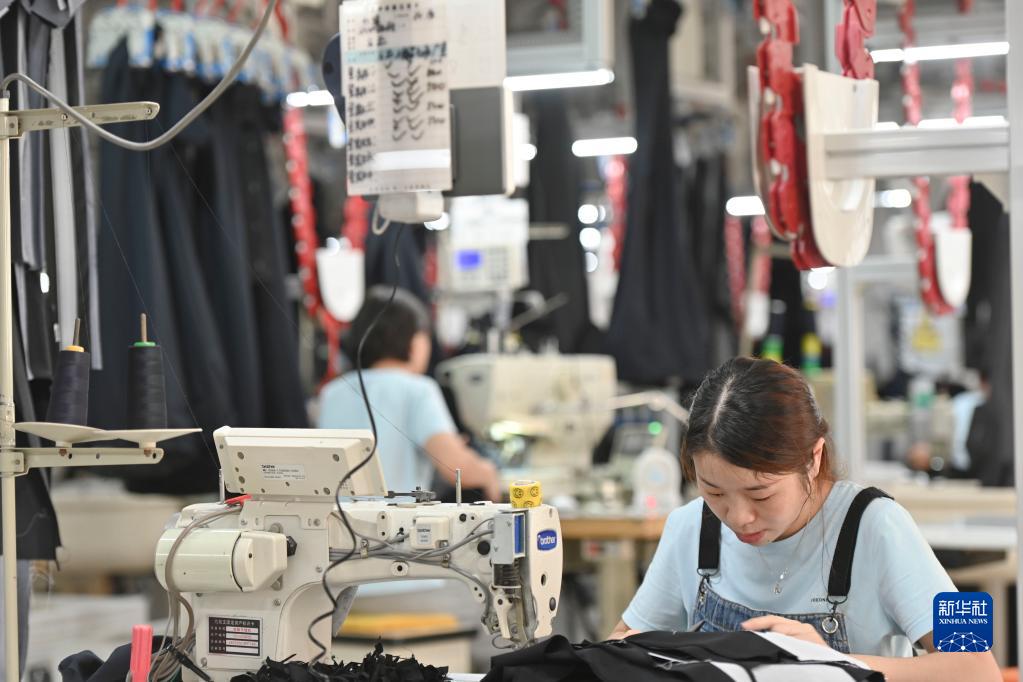 在位于福建省泉州市經(jīng)濟(jì)技術(shù)開發(fā)區(qū)的九牧王西褲智能化生產(chǎn)車間,工人在自動(dòng)化西褲吊掛流水線上作業(yè)(7月30日攝)。新華社記者 宋為偉 攝
