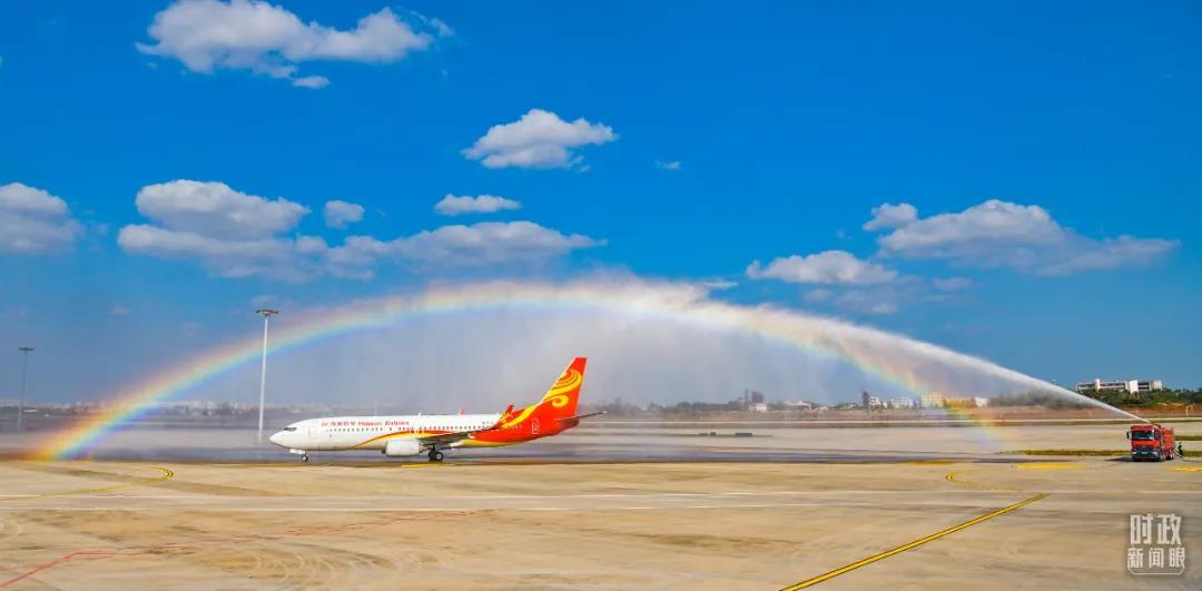 △2021年12月2日,??诿捞m國際機場二期正式投運。這是首個抵達機場二期的航班通過水門。(圖/視覺中國)