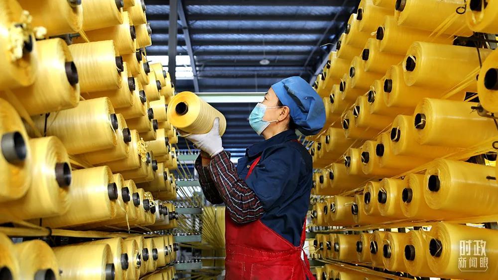 △2021年12月,江蘇連云港,工人在“扶貧車間”生產加工編織袋。(圖/視覺中國)