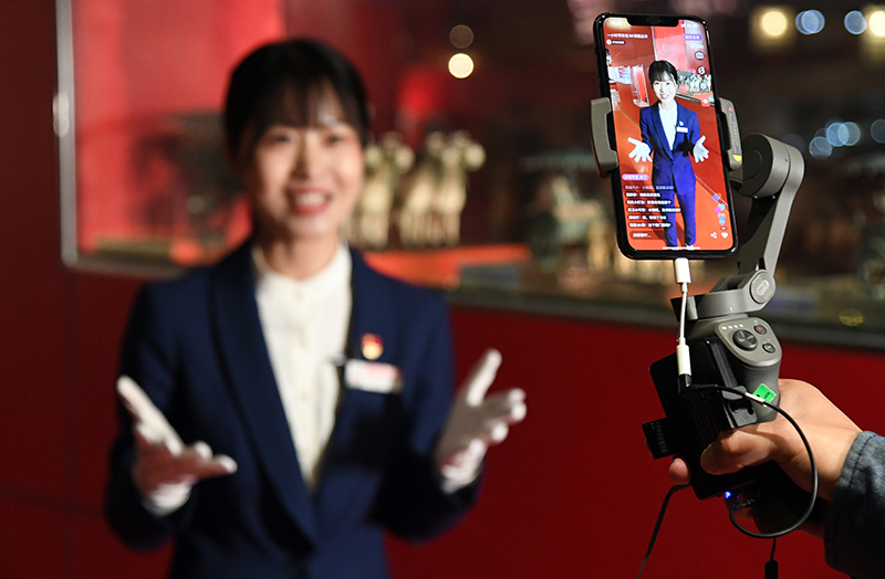 2020年4月30日,在北京汽車博物館,講解員曾紅娟通過(guò)網(wǎng)絡(luò)直播平臺(tái)為觀眾介紹館內(nèi)的藏品車。