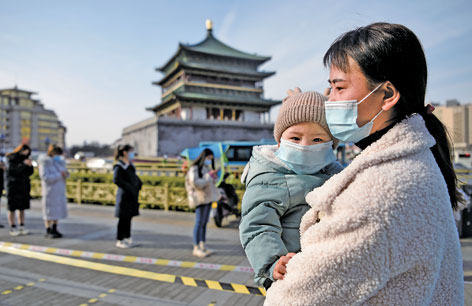 12月17日,在西安市鐘樓附近的核酸檢測點(diǎn),一位媽媽抱著寶寶排隊(duì)等待核酸檢測。新華社記者劉瀟攝