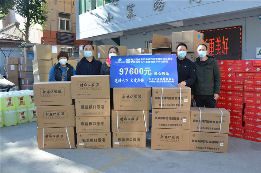 12月15日、20日,陜西光大藥業(yè)集團股份有限公司向陜西省商貿學校、西安市雁塔區(qū)小寨路街道辦事處捐贈價值10余萬元的防護口罩、消毒液等防疫物資。