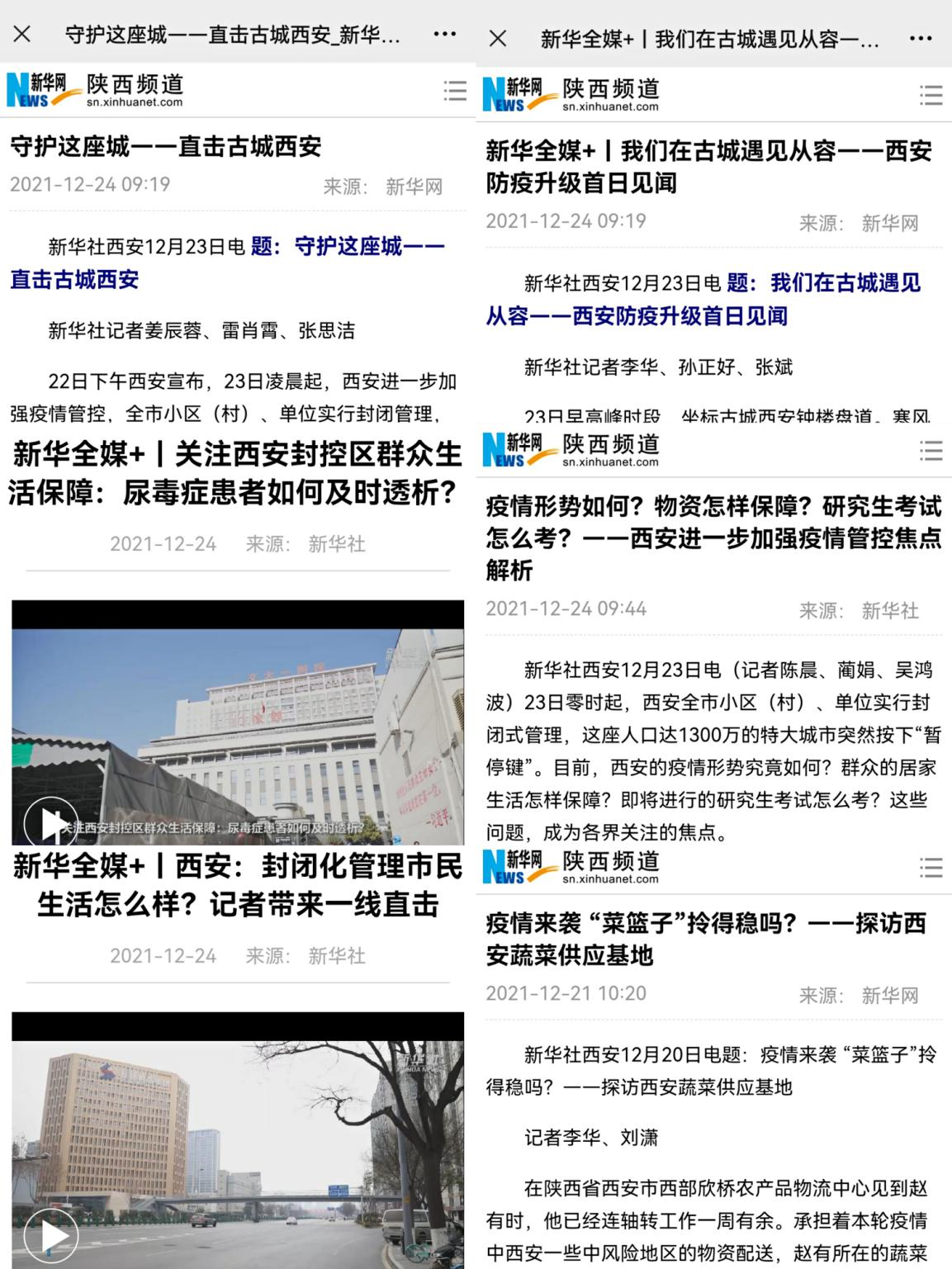 從關(guān)注尿毒癥患者如何及時(shí)透析到封閉化管理市民生活怎樣,從西安防疫升級首日見聞到記者答疑確診病例為何增長迅速,從新一輪核酸檢測現(xiàn)場到蔬菜保供打消市民恐慌……新華社記者每天從城市的各個(gè)角落發(fā)回第一手消息,用他們的筆觸、鏡頭向廣大網(wǎng)民展現(xiàn)西安城的堅(jiān)守和溫暖,最大程度還原這座城市疫情防控過程中每一個(gè)環(huán)節(jié)的進(jìn)展與成效。
