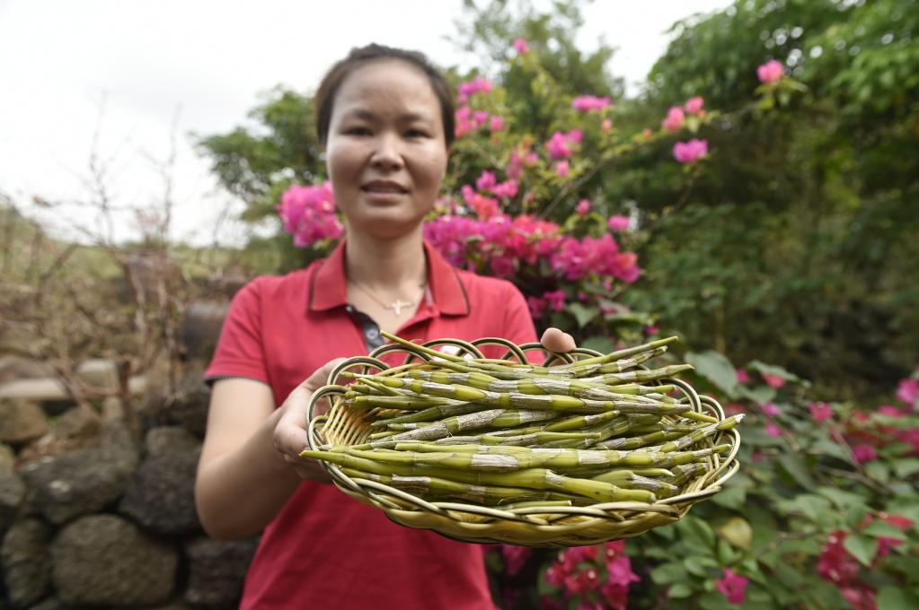 2019年3月14日,村民在海南??谑行阌^(qū)石山鎮(zhèn)施茶村石斛園展示新鮮的石斛。新華社記者 魯鵬 攝
