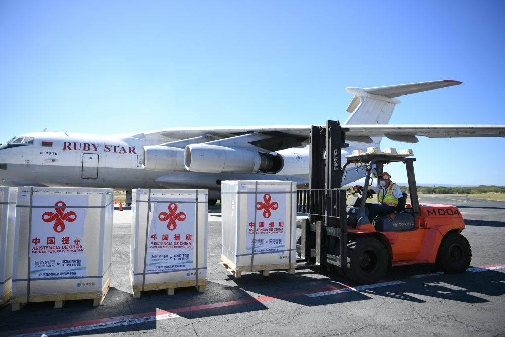↑2021年12月24日,在尼加拉瓜馬那瓜國際機場,工作人員轉運由中國國藥集團生產(chǎn)的新冠疫苗。當日,中國政府提供的第二批新冠疫苗運抵馬那瓜,助力當?shù)亻_展疫苗接種計劃。
