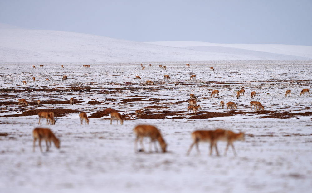↑2021年4月20日,在青??煽晌骼?,一群正在遷徙的藏羚羊向卓乃湖方向行進。