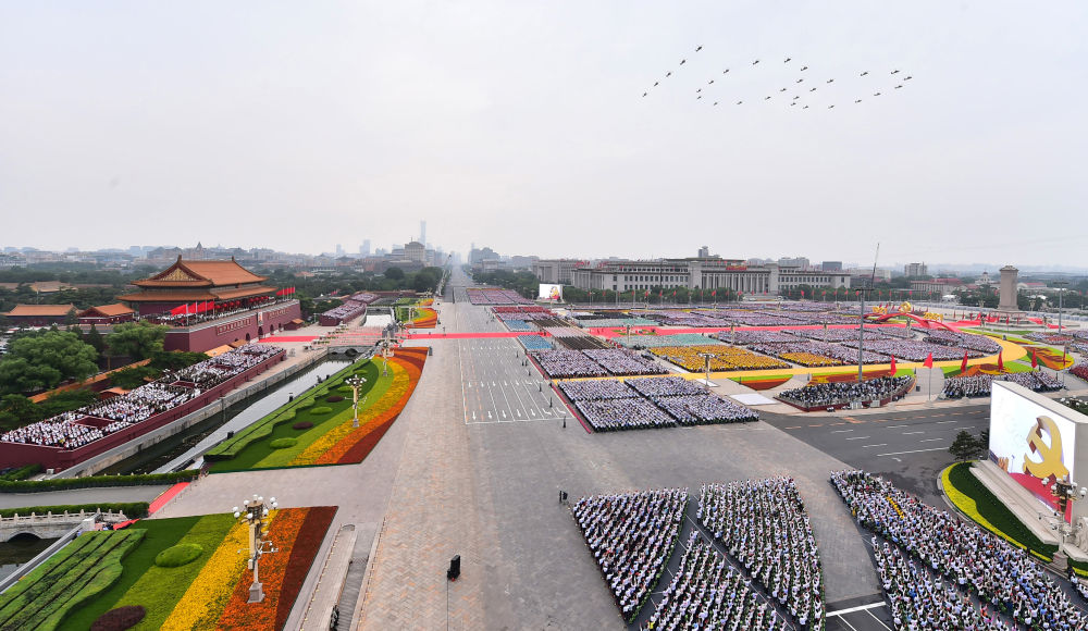 ↑2021年7月1日上午,慶祝中國共產(chǎn)黨成立100周年大會在北京天安門廣場隆重舉行。這是飛行慶祝表演。