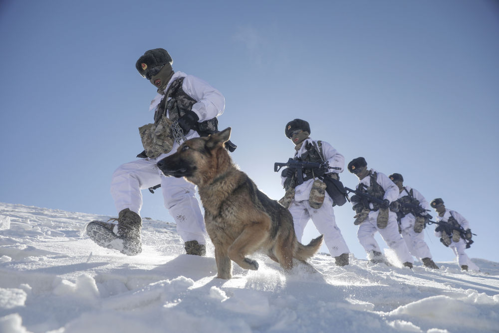 ↑2021年2月11日,駐守帕米爾高原的新疆喀什軍分區(qū)某邊防團托克滿蘇邊防連官兵按計劃對海拔5100米的山口實施例行巡邏。