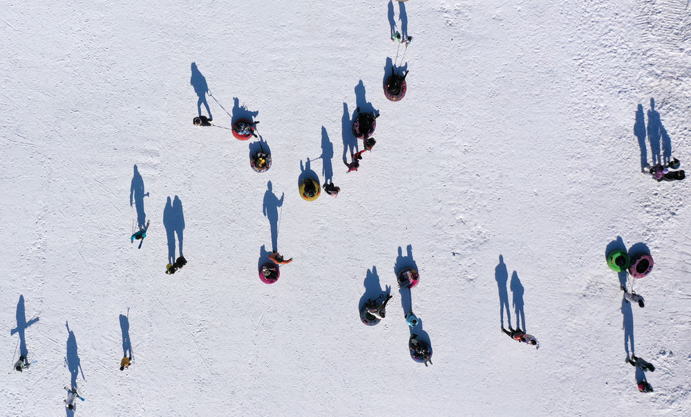↑2021年12月5日,游客在寧夏銀川市鳴翠湖滑雪場體驗雪上運動(無人機照片)。