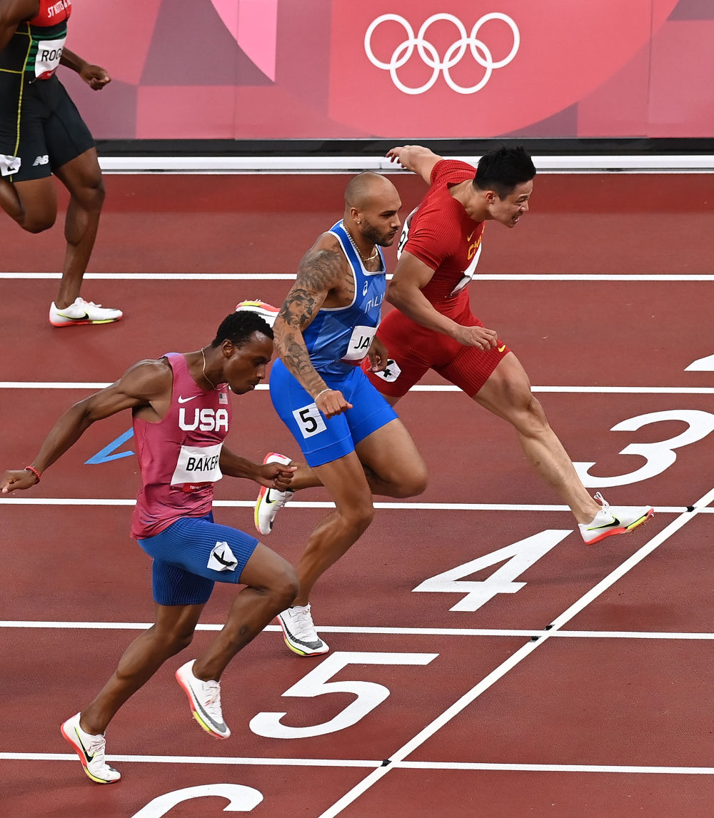 ↑2021年8月1日,東京奧運會田徑男子100米半決賽在東京新國立競技場舉行。中國選手蘇炳添(右一)跑出9秒83,以半決賽第一晉級決賽,同時創(chuàng)造了新的亞洲紀錄。