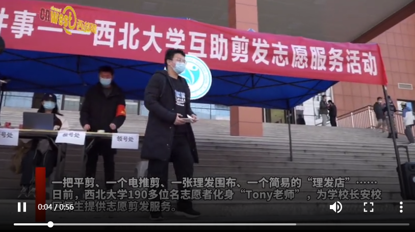 一把平剪、一個電推剪、一張理發(fā)圍布、一個簡易的“理發(fā)店”……日前,西北大學(xué)190多位名志愿者化身“Tony老師”,為學(xué)校長安校區(qū)師生提供志愿剪發(fā)服務(wù)。