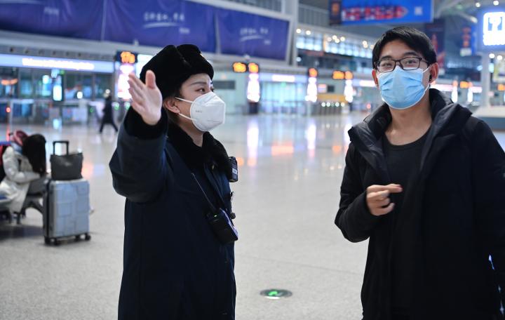 1月16日,西安北站客運(yùn)員(左)在候車(chē)大廳引導(dǎo)旅客乘車(chē)。新華社記者 陶明 攝