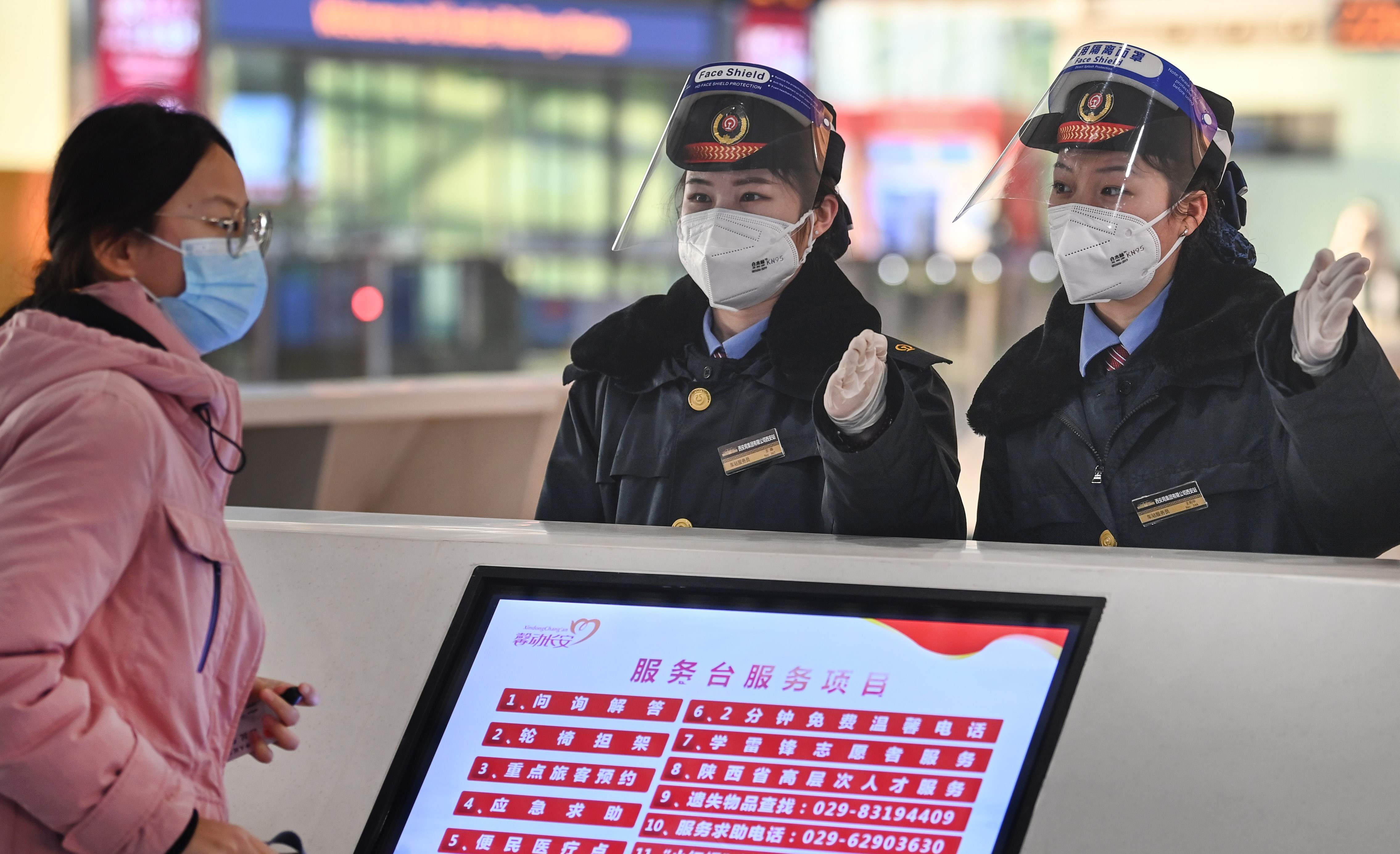 1月16日,西安北站服務(wù)臺(tái)客運(yùn)員(右一二)在解答旅客問(wèn)題。