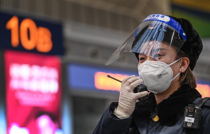 1月16日,工作人員對(duì)西安北站站臺(tái)進(jìn)行消殺。新華社記者 陶明 攝