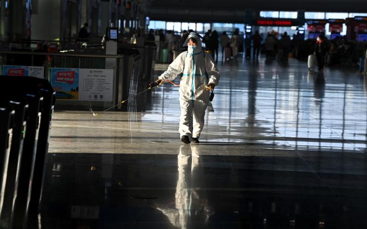 1月16日,工作人員在對(duì)西安北站候車(chē)大廳進(jìn)行環(huán)境消毒。新華社記者 陶明 攝