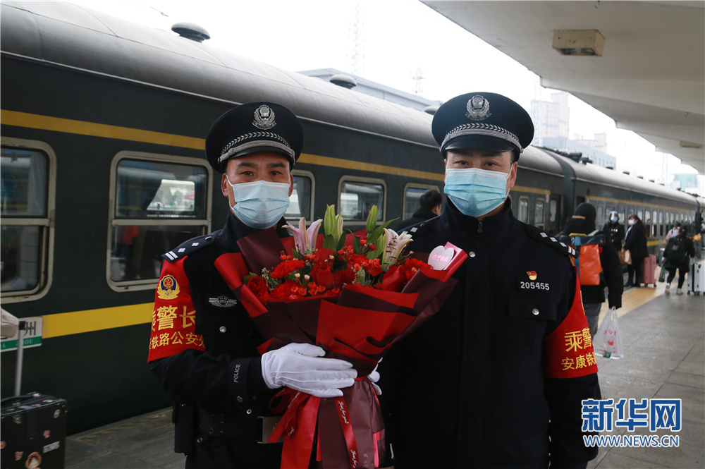 今年59歲的老汪是安康鐵路公安處乘警支隊(duì)的老乘警。1988年參加公安工作的他在紫陽站派出所工作了13年。2001年調(diào)入乘警支隊(duì),在乘警崗位上一待就是21年。而今年的春運(yùn)對老汪來說有著特殊的意義,春運(yùn)首日也是老汪最后一趟值乘。在安康站始發(fā)前,支隊(duì)政委呂昭琦專程送來鮮花表示對老汪多年工作的感謝。已堅(jiān)守34個春運(yùn),用老汪的話來說,自己沒有過轟轟烈烈的大事,只是做好本職的工作,從沒有對不起過頭頂?shù)木铡?/p>
