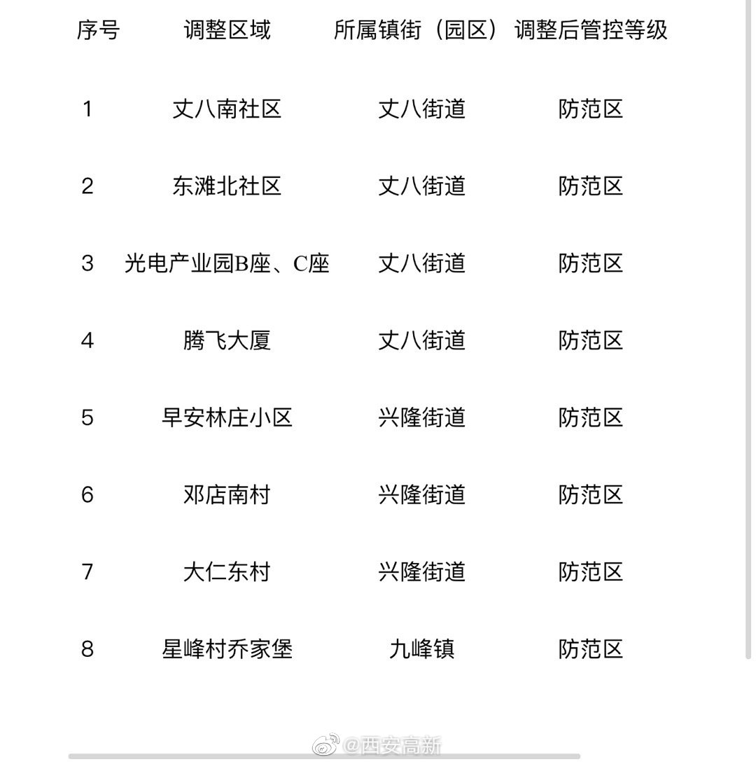 按照國務(wù)院聯(lián)防聯(lián)控機制和省、市關(guān)于新冠肺炎疫情社區(qū)防控工作要求,結(jié)合西安高新區(qū)疫情防控形勢,經(jīng)高新區(qū)新冠肺炎疫情防控指揮部研判,報市疫情防控指揮部備案同意,決定自2022年1月23日起,對部分區(qū)域進行調(diào)整管理,具體如下:將丈八街道丈八南社區(qū)等3個鎮(zhèn)街的8個小區(qū)村、樓棟調(diào)整為防范區(qū)(具體名單見下表)。