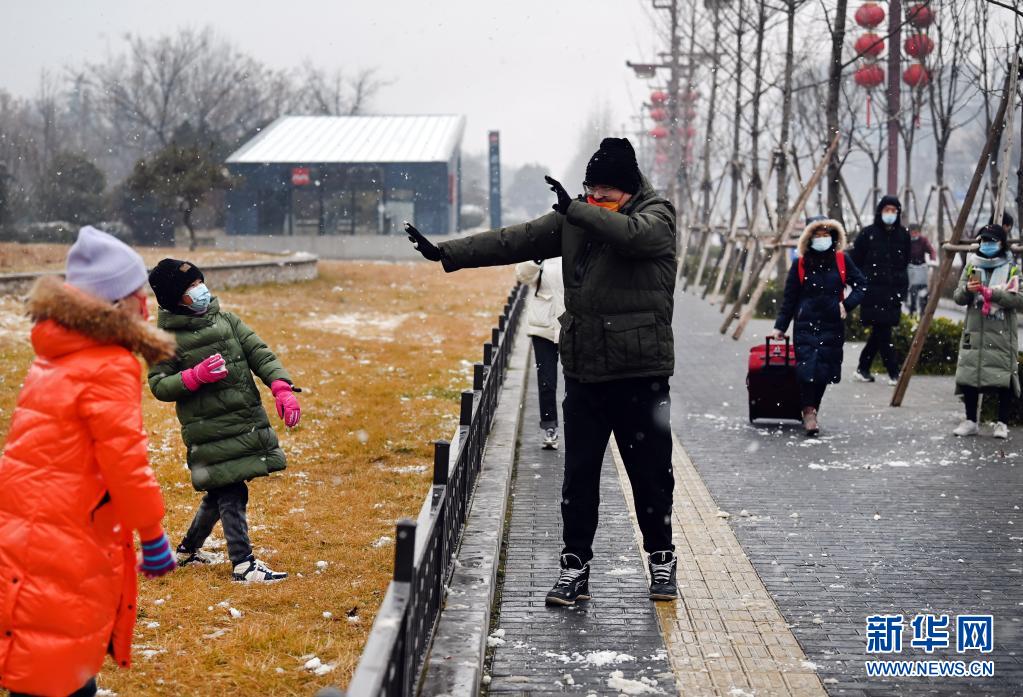 1月23日,小朋友在街頭與家人打雪仗。