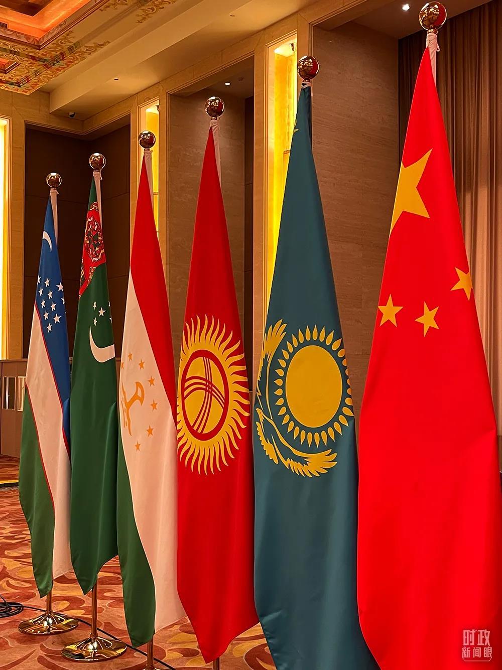 △會(huì)場擺放的中國與中亞五國國旗。(總臺(tái)央視記者趙化拍攝)