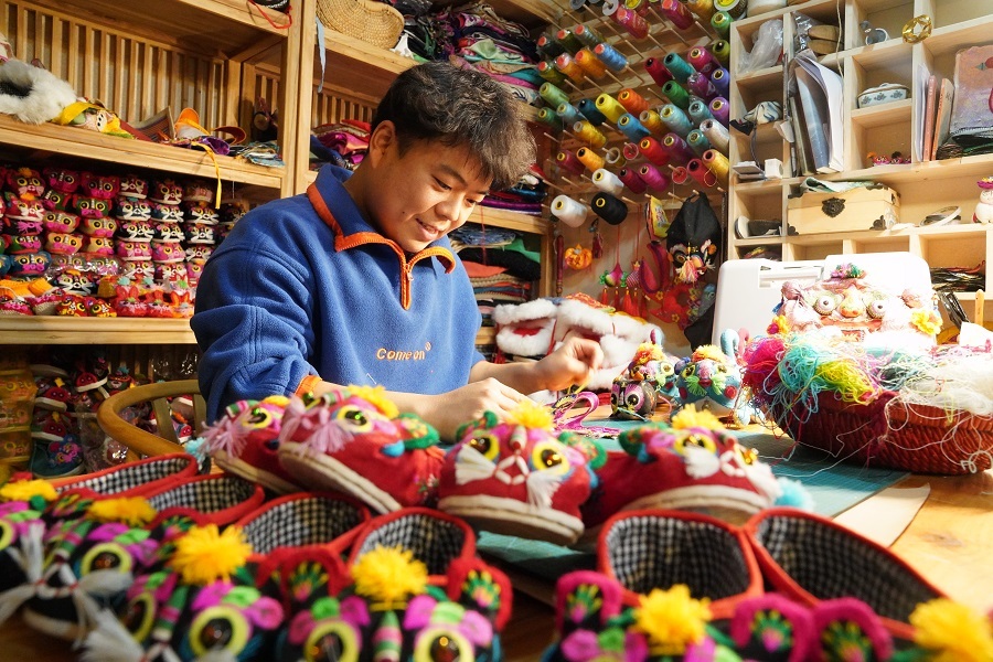 “老虎是百獸之王,是保平安的吉祥物,也是我們民俗文化中‘福’字的諧音。”夏璐璐介紹,他在設(shè)計(jì)制作虎頭帽、虎頭鞋的過(guò)程中,會(huì)使用不同的手法、材質(zhì)和造型,這也讓小老虎看起來(lái)更加可愛(ài)。