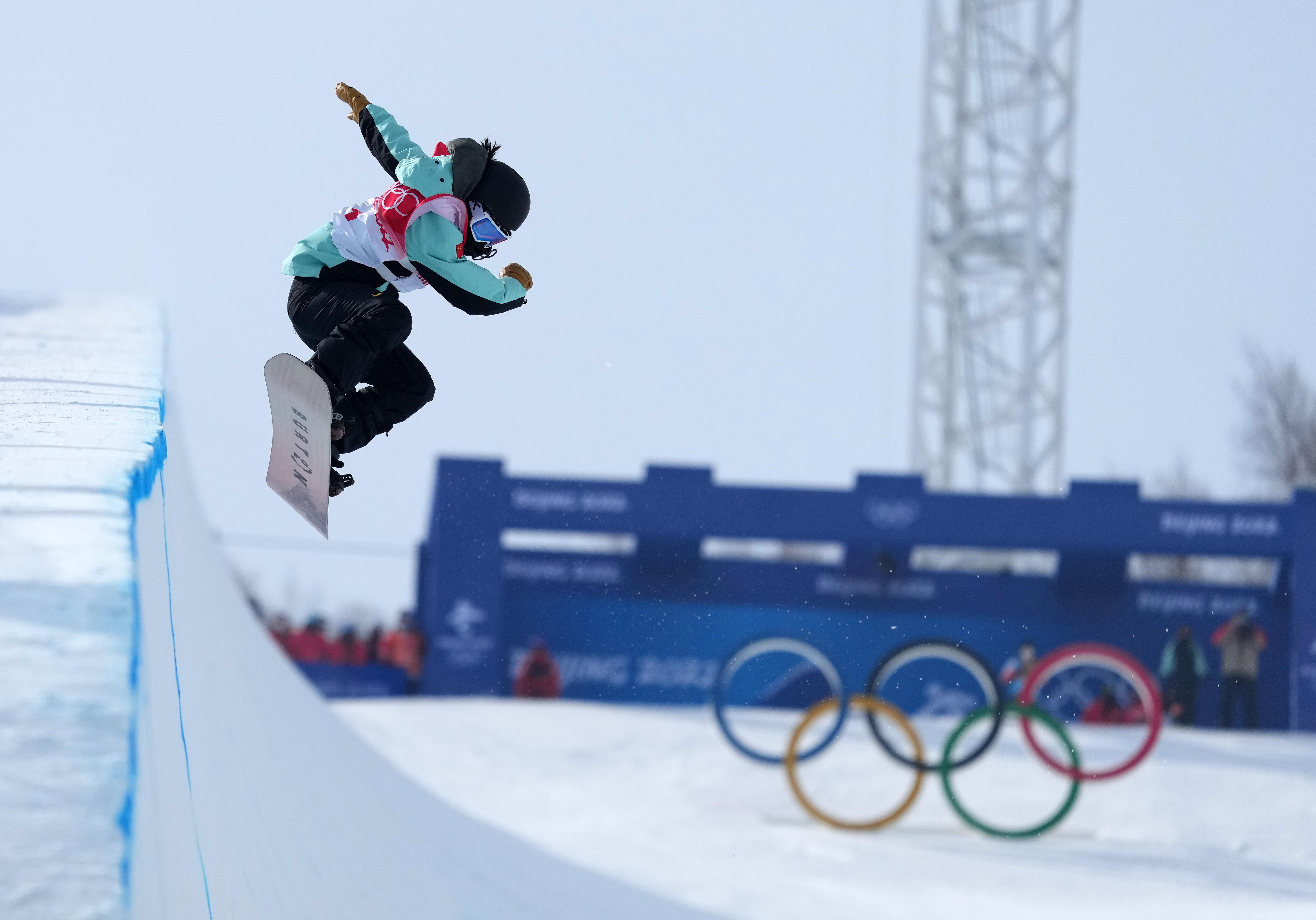 △ 2月10日,中國(guó)選手蔡雪桐在北京冬奧會(huì)單板滑雪女子U型場(chǎng)地技巧決賽中。
