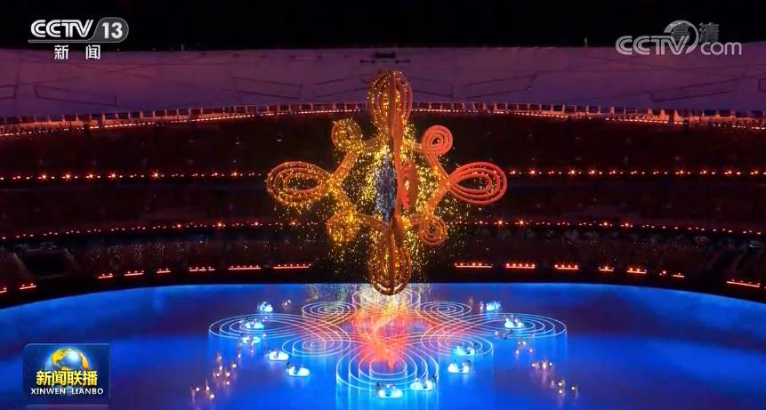 21時(shí)35分,2008年北京奧運(yùn)會(huì)主題歌《我和你》的動(dòng)人歌聲再次響起,閃閃發(fā)光的奧運(yùn)五環(huán)從場地中央升起。主火炬“大雪花”緩緩落下,在純潔空靈的《雪花》歌聲中,燃燒了16天的奧運(yùn)之火漸漸熄滅。
