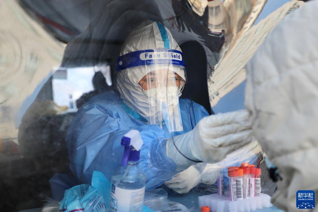 1月27日,在黑龍江綏芬河市一處核酸采集點,醫(yī)護(hù)人員對居民進(jìn)行核酸采樣。新華社記者 徐凱鑫 攝