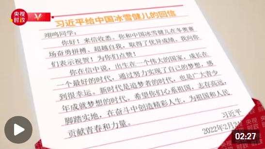 總書記在回信中說,中國(guó)冰雪健兒在冬奧賽場(chǎng)奮勇拼搏、超越自我,取得了優(yōu)異成績(jī)。“我向你們表示祝賀!為你們點(diǎn)贊!”