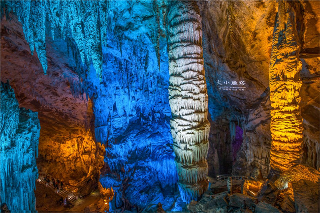 洞中金鑾寶殿、雷峰寶塔、玉柱擎天、玉林瓊花、犬牙晶花、千年之吻,動(dòng)物王國(guó)、海底龍宮、巨幕飛瀑、石田珍珠、生命之源、珊瑚瑤池等景點(diǎn)形態(tài)迥異,光怪陸離,讓人不禁感嘆大千世界無奇不有,大自然造物之神奇。