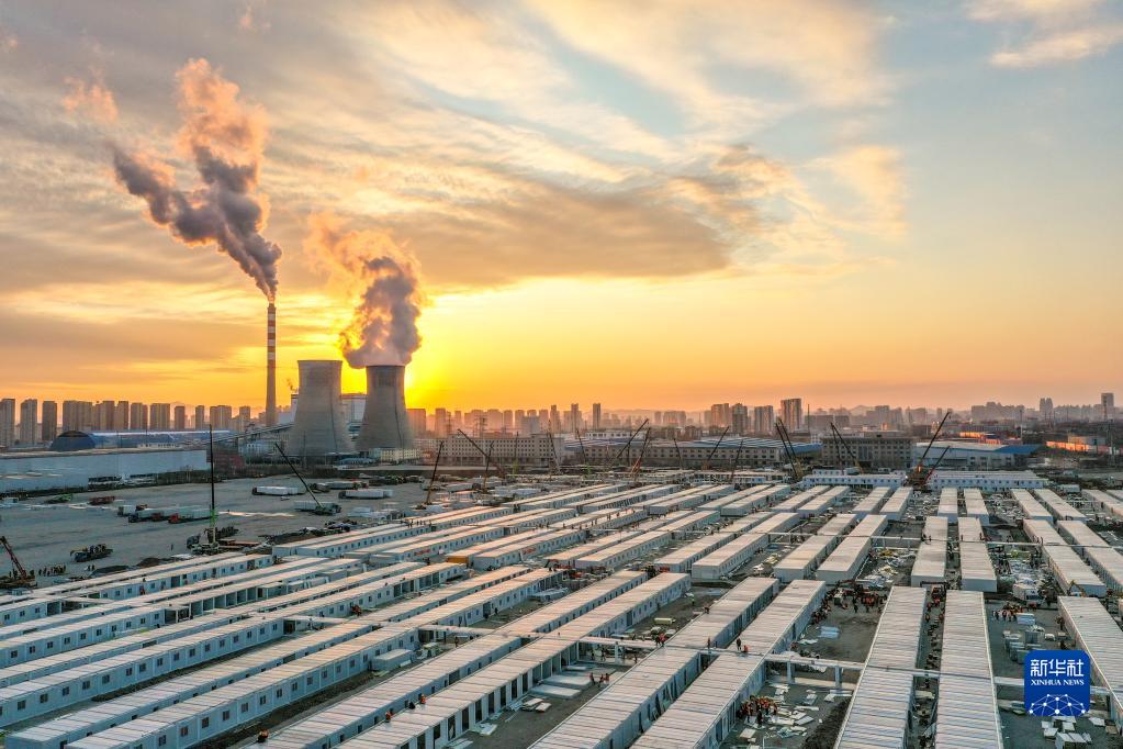 這是3月20日傍晚拍攝的吉林市高新南區(qū)隔離方艙建設現(xiàn)場(無人機照片)。新華社記者 張楠 攝