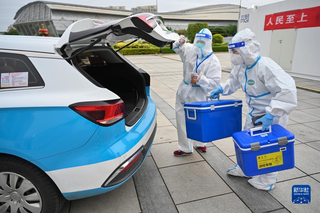 3月24日,在福建泉州市海峽體育中心聯(lián)合方艙核酸檢測基地,參加“抗疫志愿車隊”的出租車司機(左)協(xié)助醫(yī)務人員裝運核酸檢測樣本。新華社發(fā)(周義攝)