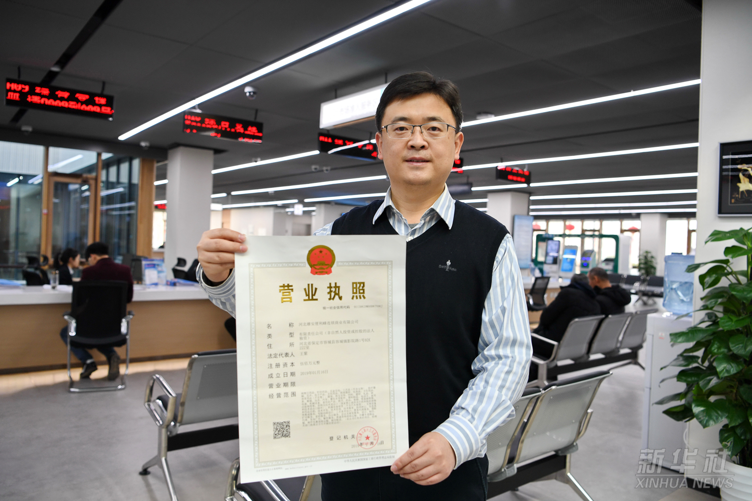 一家入駐雄安新區(qū)的企業(yè)工作人員在市民服務中心內(nèi)展示辦理的營業(yè)執(zhí)照(2019年1月17日攝)。